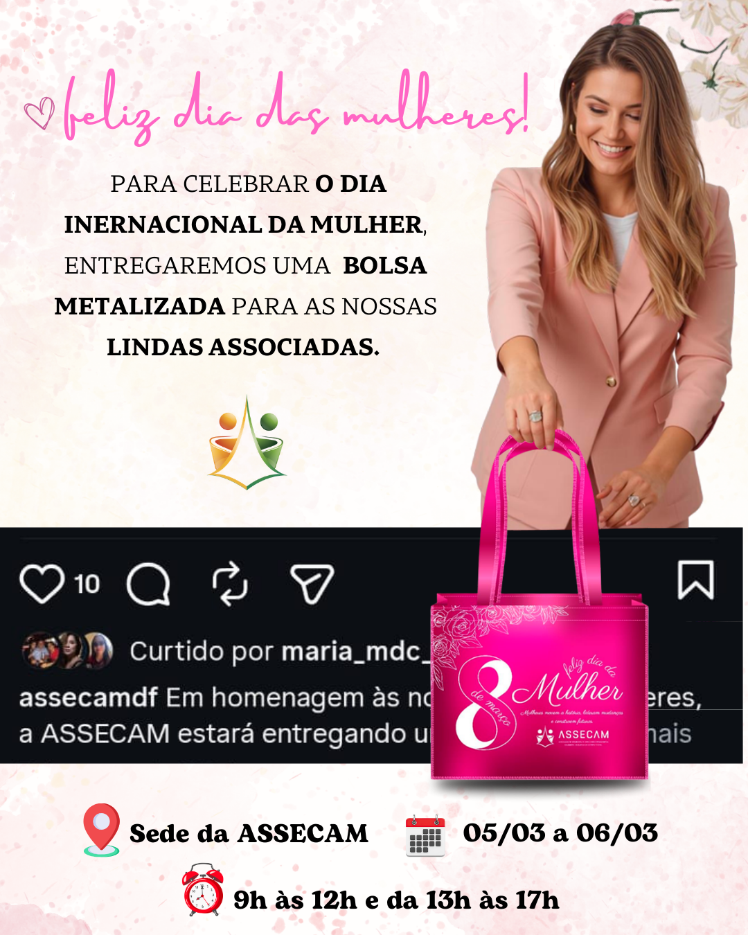 Em homenagem ao Dia Internacional da Mulher, a ASSECAM presenteará suas filiadas com uma bolsa metalizada especial. 📅 Datas: 05/03 e 06/03 ⏰ Horário: das